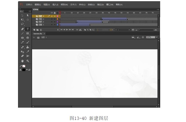 33.單擊【場(chǎng)景1】,進(jìn)入主場(chǎng)景中。單擊圖層下方的【新建圖層】按鈕,插入圖層4,如圖13-40所示。