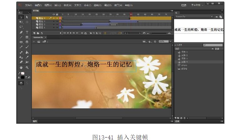 34.選中第50幀,按F6鍵插入關(guān)鍵幀。從庫(kù)面板中將元件4拖入到舞臺(tái),并調(diào)整其位置,如圖13-41所示。