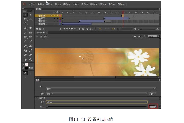36.選中第50幀,在【屬性】面板中將【顏色】的Alpha值設(shè)置0%,如圖13-43所示。