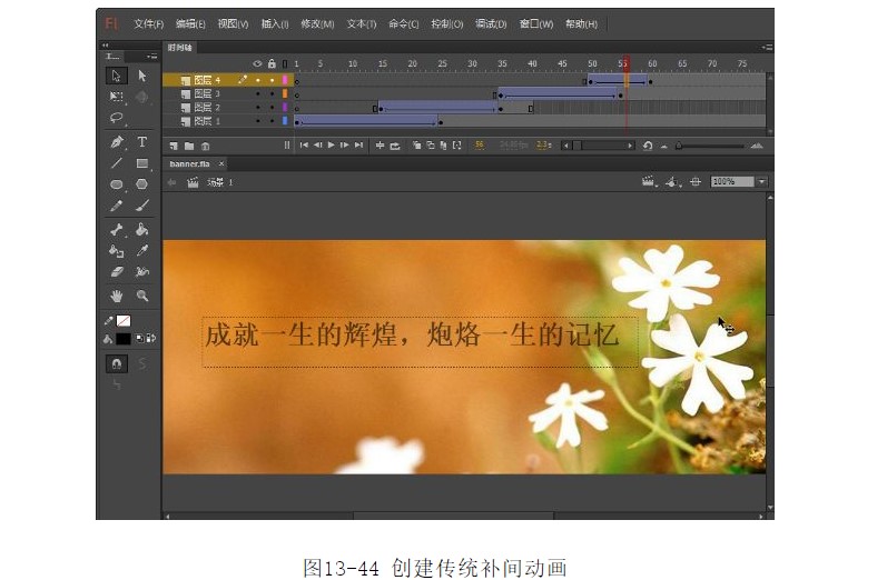 37.在第50幀~63幀之間的任意一幀上單擊鼠標(biāo)右鍵,在彈出菜單中選擇【創(chuàng)建傳統(tǒng)補(bǔ)間動(dòng)畫(huà)】選項(xiàng),創(chuàng)建傳統(tǒng)補(bǔ)間動(dòng)畫(huà),如圖13-44所示。