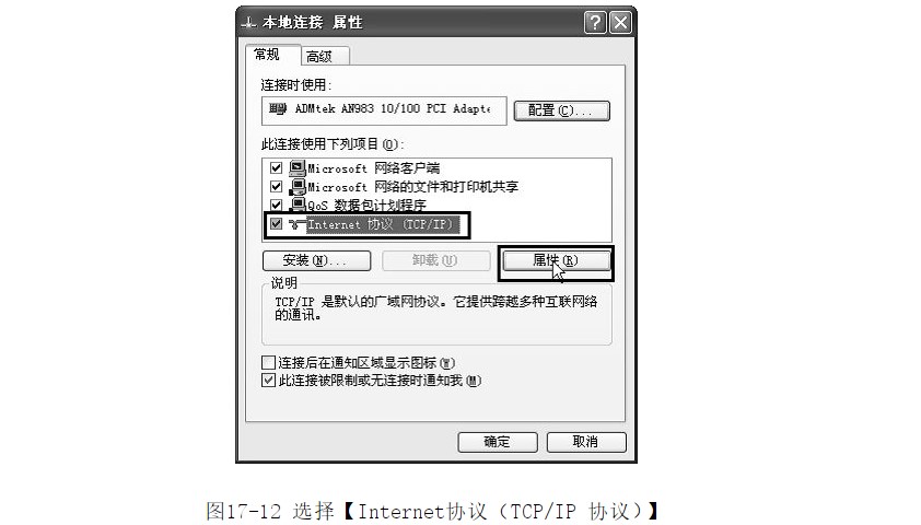 ?鼠標右擊【網(wǎng)絡鄰居】,在彈出菜單中選擇【屬性】,再使用鼠標右鍵單擊【本地連接】,選擇【屬性】,在【本地連接屬性】對話框中選擇【Internet協(xié)議(TCP/IP協(xié)議)】,如圖17-12所示。
