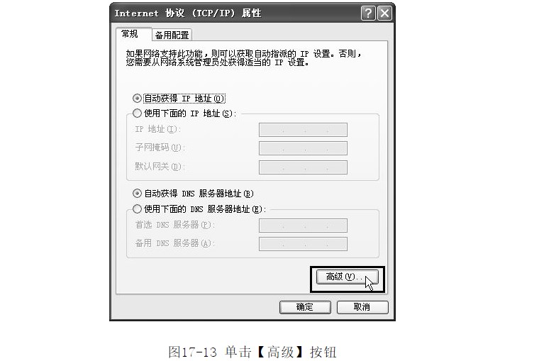 ?單擊【屬性】進入【Internet協(xié)議(TCP/IP協(xié)議)屬性】對話框,單擊【高級】按鈕,如圖17-13所示。