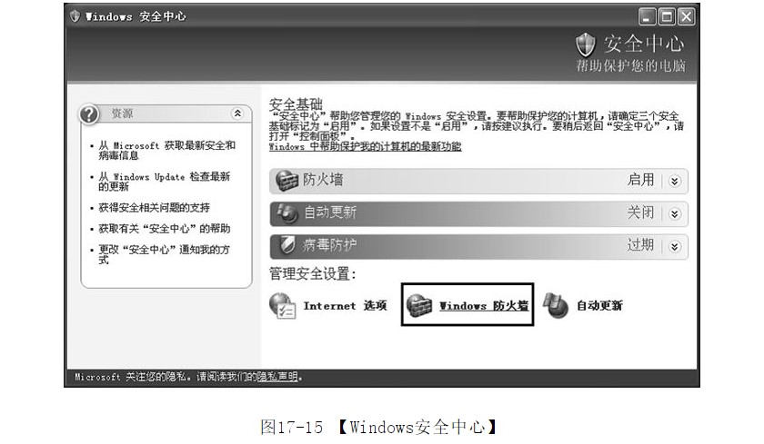 ?首先進入【控制面板】,并雙擊【安全中心】圖標,進入【W(wǎng)indows安全中心】,如圖17-15所示,單擊【W(wǎng)indows防火墻】圖標。