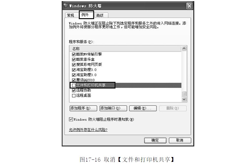 ?打開【W(wǎng)indows防火墻】對話框,單擊【例外】選項卡。把【程序和服務】列表中【文件和打印機共享】前復選框中的鉤去掉即可,如圖17-16所示。