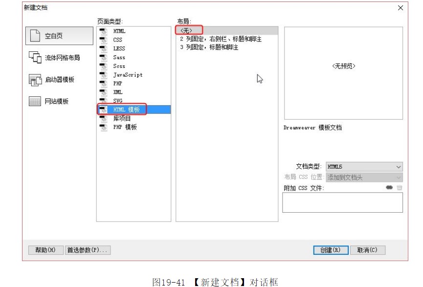 ?彈出【新建文檔】對話框,在對話框中選擇【空白頁】|【HTML模板】|【無】選項(xiàng),如圖19-41所示。