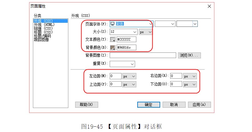 ?選擇菜單中的【修改】|【頁面屬性】命令,彈出【頁面屬性】對話框,在該對話框中將【頁面字體】設(shè)置為宋體,【大小】設(shè)置為12,【文本顏色】設(shè)置為#CCCCCC,【字體顏色】設(shè)置為#96816c,【右邊距】、【左邊距】、【上邊距】、【下邊距】設(shè)置為0,如圖19-45所示。