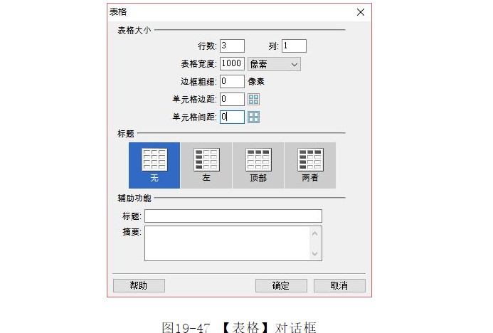 ?將光標(biāo)放置在頁面中,選擇菜單中的【插入】|【表格】命令,彈出【表格】對話框,在對話框中將【行數(shù)】設(shè)置為3,【列數(shù)】設(shè)置為1,【表格寬度】設(shè)置為1000像素,如圖19-47所示。