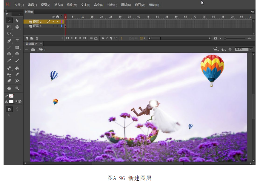 ?選中圖層1的第1幀,從庫面板中將一幅圖像拖入到舞臺中。單擊時間軸左下角的【插入圖層】按鈕,新建一圖層2,如圖A-96所示。