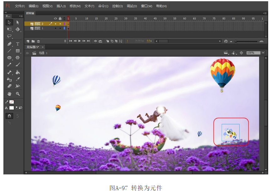 ?將準(zhǔn)備好的蜜蜂圖像拖入到舞臺中,選擇【修改】|【轉(zhuǎn)換為元件】命令,將圖像轉(zhuǎn)換為元件,如圖A-97所示。