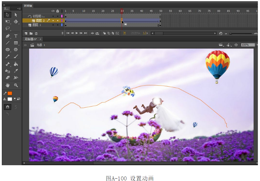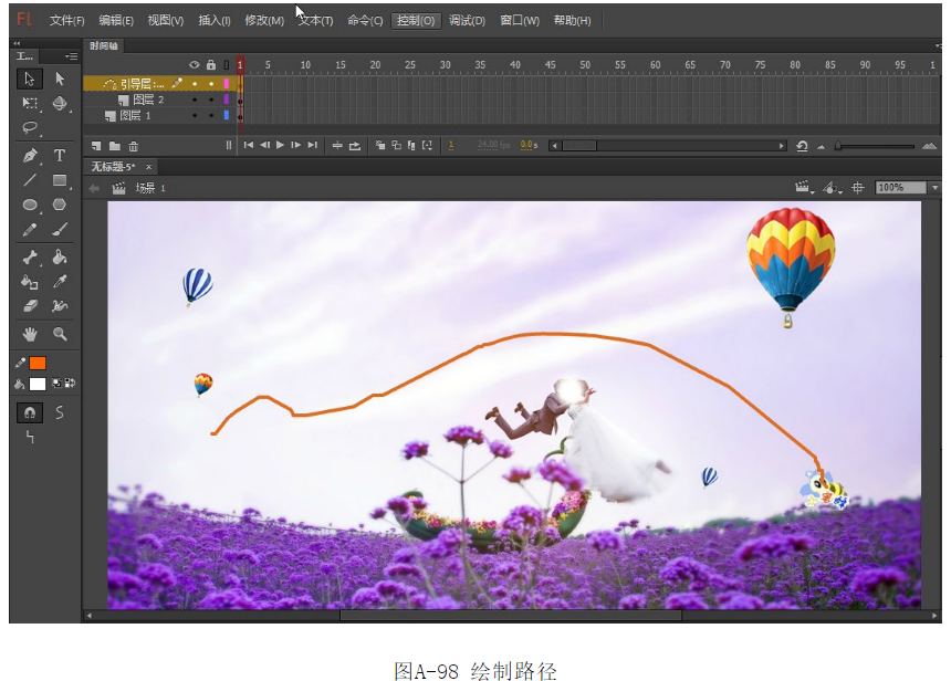 ?在圖層2的上面單擊鼠標(biāo)右鍵,在彈出列表中選擇【添加傳統(tǒng)運動引導(dǎo)層】選項。選擇工具箱中的【鉛筆工具】,繪制一條引導(dǎo)路徑,如圖A-98所示。