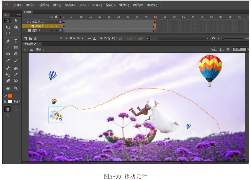 ?在圖層1、圖層3的第50幀,按F6鍵插入關(guān)鍵幀,在圖層2的第50幀按F5鍵插入幀,在第50幀將圖形元件拖動到路徑的另一端,如圖A-99所示。