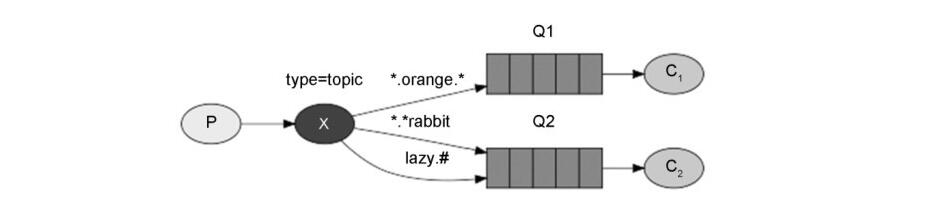 主題:ExchangeType為topic。發(fā)送消息時(shí)需要指定交換機(jī)及RoutingKey,消費(fèi)者的消息隊(duì)列綁定到該交換機(jī)并匹配到RoutingKey實(shí)現(xiàn)消息的訂閱,訂閱后可接收消息。只有消費(fèi)者將隊(duì)列綁定到該交換機(jī)且指定的RoutingKey符合匹配規(guī)則,才能收到消息。其中RoutingKey可以設(shè)置成通配符,如*或#(*表示匹配RoutingKey中的某個(gè)單詞,#表示任意的RoutingKey的消息都能被收到)。如果RoutingKey由多個(gè)單詞組成,則單詞之間用“.”來(lái)分隔,如下圖所示。