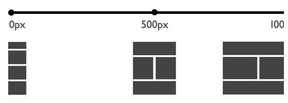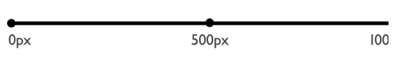 首先,畫一條橫線,確定你的范圍。選擇你在視口寬度中使用的單位。如果你是用像素,那么橫線最左邊表示0像素。在響應式設(shè)計中,最右邊的點通常代表最接近無限大的那個斷點,比如“大于1000像素”或者類似的。然后,在你覺得有可能成為斷點的地方標上一些點。不用害怕出錯,因為當你的內(nèi)容確定后,你肯定會修改這些斷點的。所以,或多或少的在你的橫線范圍內(nèi)標記上一些點。比如,如果你的范圍是從0px到大于1000px,你可以確定一個500px的斷點,并把你的點標記在橫線的中間(見圖1.1)。
