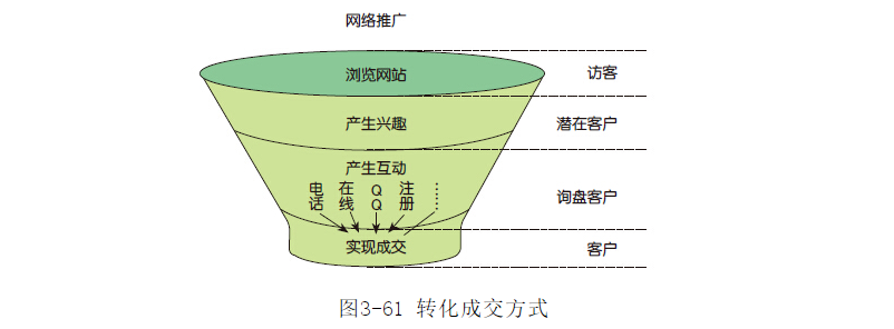 從圖3-61可以看到,最關(guān)鍵的是讓產(chǎn)生興趣的潛在客戶產(chǎn)生互動(dòng),這需要我們?cè)谄髽I(yè)網(wǎng)站上布局多種聯(lián)絡(luò)方式,便于訪客在任何頁面、任何地方看到企業(yè)的各種聯(lián)絡(luò)途徑,讓訪客主動(dòng)與企業(yè)取得聯(lián)絡(luò)。