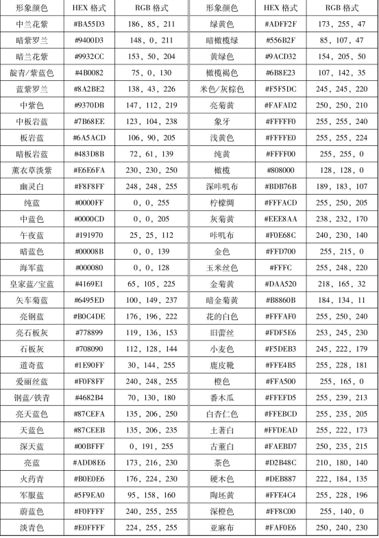 網(wǎng)站上的各種色彩,是通過(guò)用數(shù)字形態(tài)來(lái)模擬三原色調(diào)配得出的。通過(guò)表2-1,可以快速地索引和使用一些自然界中的常用顏色在電腦中的表示方法。