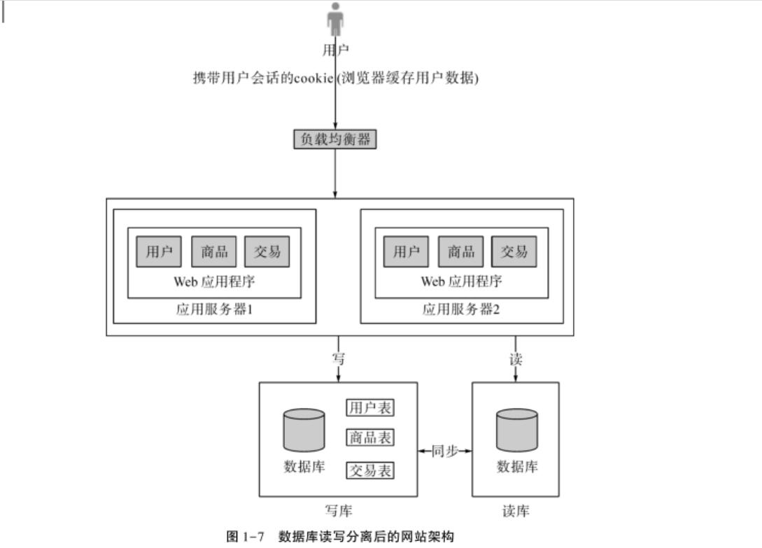 上面我們總是假設(shè)數(shù)據(jù)庫負(fù)載正常,但隨著訪問量的提高,數(shù)據(jù)庫的負(fù)載也在慢慢增大。那么可能有人馬上就想到跟應(yīng)用服務(wù)器一樣,把數(shù)據(jù)庫一分為二再負(fù)載均衡即可。但對于數(shù)據(jù)庫來說,并沒有那么簡單。假如我們簡單地把數(shù)據(jù)庫一分為二,然后將對于數(shù)據(jù)庫的請求,分別負(fù)載到A機(jī)器和B機(jī)器,那么顯而易見會造成兩臺數(shù)據(jù)庫數(shù)據(jù)不統(tǒng)一的問題。對于這種情況,我們可以先考慮使用讀寫分離的方式。讀寫分離后的數(shù)據(jù)庫網(wǎng)站架構(gòu)如圖1-7所示