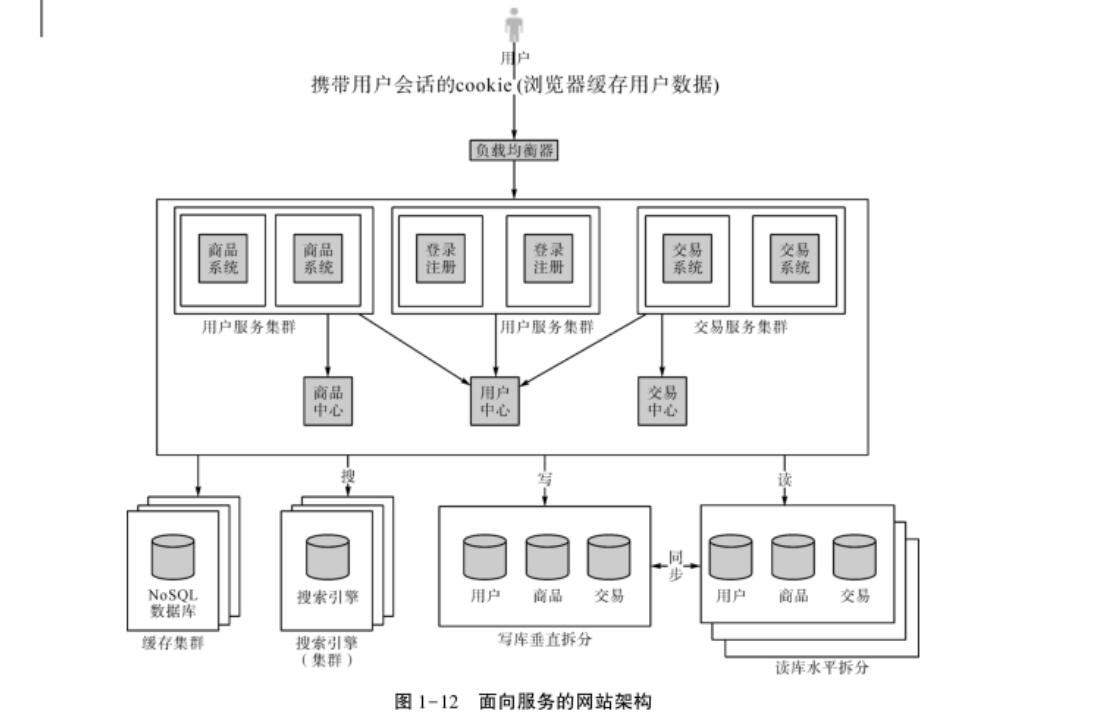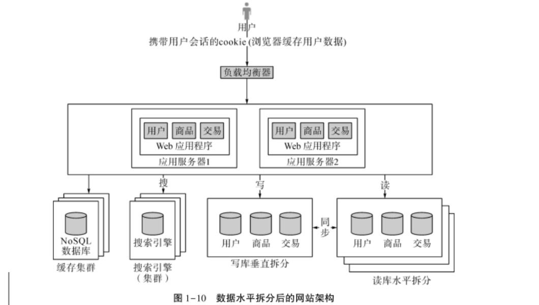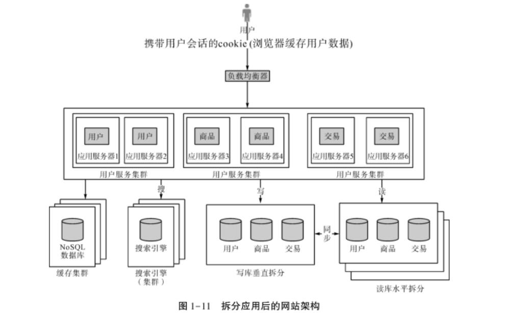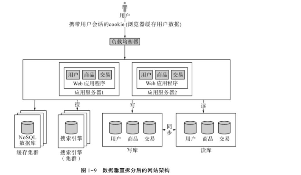 數(shù)據(jù)垂直拆分的意思是把數(shù)據(jù)庫中不同的業(yè)務(wù)數(shù)據(jù)拆分到不同的數(shù)據(jù)庫中,結(jié)合現(xiàn)在的例子,就是把交易、商品、用戶的數(shù)據(jù)分開。其優(yōu)點在于,解決了原來把所有業(yè)務(wù)放在一個數(shù)據(jù)庫中的壓力問題,可以根據(jù)業(yè)務(wù)的特點進(jìn)行更多的優(yōu)化;缺點是需要維護(hù)多個數(shù)據(jù)庫。數(shù)據(jù)垂直拆分后的網(wǎng)站架構(gòu)如圖1-9所示。