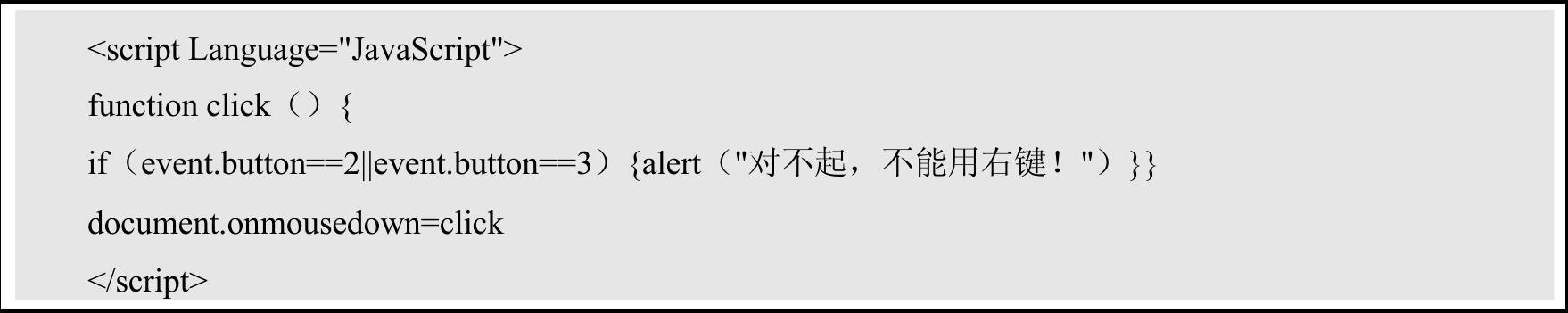 (2)屏蔽鼠標右鍵。它的顯示源文件功能即在所需保護的頁面文件(上例中為index.html文件)中加入以下代碼(當(dāng)右鍵被單擊時將出現(xiàn)圖8.1所示提示框)。