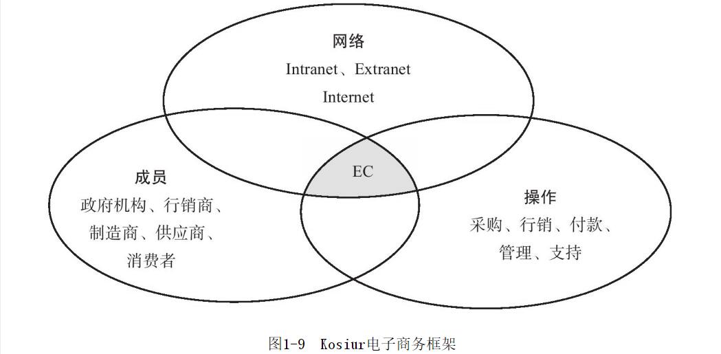 (二)Kosiur電子商務(wù)框架DavidKosiur認(rèn)為電子商務(wù)是一種商業(yè)市場成員、交易操作流程與網(wǎng)絡(luò)環(huán)境結(jié)構(gòu)的交集產(chǎn)物。不同網(wǎng)絡(luò)環(huán)境下電子商務(wù)的表現(xiàn)形式、側(cè)重要求有所不同:Intranet能使一個組織內(nèi)部的信息、管理控制得以高效實現(xiàn);Extranet能在不同的組織之間形成合作性的網(wǎng)絡(luò),以降低交易成本提高經(jīng)營績效;Internet則能在全球范圍內(nèi)實現(xiàn)各類市場主體之間信息的高效傳遞從而提高社會整體福利。Kosiur電子商務(wù)框架如圖1-9所示。