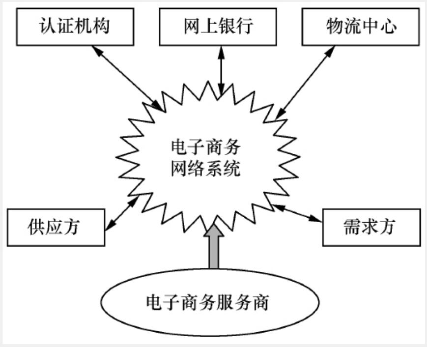 電子商務(wù)系統(tǒng)包括電子商務(wù)網(wǎng)絡(luò)系統(tǒng)、供應(yīng)方、需求方、認(rèn)證機(jī)構(gòu)、物流中心、網(wǎng)上銀行、電子商務(wù)服務(wù)商等,結(jié)構(gòu)示意圖如圖1.5所示。