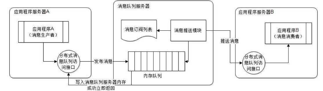 消息生產(chǎn)者應(yīng)用程序通過遠(yuǎn)程訪問接口將消息推送給消息隊(duì)列服務(wù)器,消息隊(duì)列服務(wù)器將消息寫入本地內(nèi)存隊(duì)列后立即返回成功響應(yīng)給消息生產(chǎn)者。消息隊(duì)列服務(wù)器根據(jù)消息訂司列表查找訂閱該消息的消息消費(fèi)者應(yīng)用程序,將消息隊(duì)列中的消息按照先進(jìn)先出(FIFO)的原則將消息通過遠(yuǎn)程通信接口發(fā)送給消息消費(fèi)者程序。