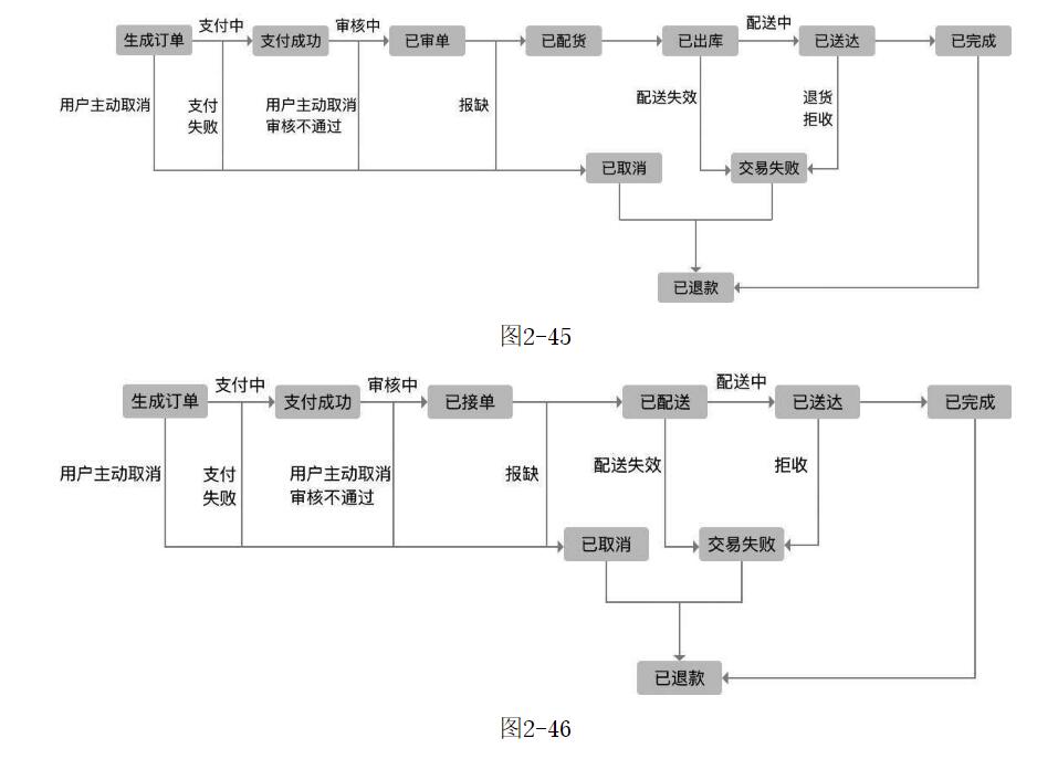 圖2-45和圖2-46所示分別是電商和O2O訂單的流轉(zhuǎn)過(guò)程。