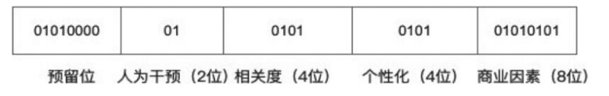 ●按不同的權(quán)重維度單獨計算,生成一個長位數(shù)的標識符,每個權(quán)重在標識符上有它自己的位置。按照優(yōu)先級的順序從左到右依次排列??紤]到機器計算的易用性,可以在加權(quán)時使用十進制,然后統(tǒng)計時轉(zhuǎn)換成二進制。位數(shù)和排序可以根據(jù)具體業(yè)務(wù)場景制訂,