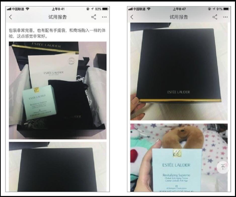 “雅詩蘭黛面霜”的試用報告中關(guān)于包裝的展示如圖4-18所示,賣家不惜花費人力物力也要一層層地包裹商品,而這樣的做法也讓消費者感受到賣家對于貨物投遞的重視與用心,并因此獲得好評:“包裝非常完善,也配有手提袋,和商城購入一樣的體驗,這點感覺非常好。”好的包裝會讓消費者感到安心與放心,并很可能因為良好的購物體驗而引發(fā)其再次消費。因此,對于移動電商而言,商品的外包裝也是銷售中不容忽視的重要環(huán)節(jié)。當(dāng)消費者還未在店鋪中購物時,首先通過視覺傳達告知消費者店鋪還提供了良好的包裝服務(wù),能夠在一定程度上使消費者下定決心進行初次購買。
