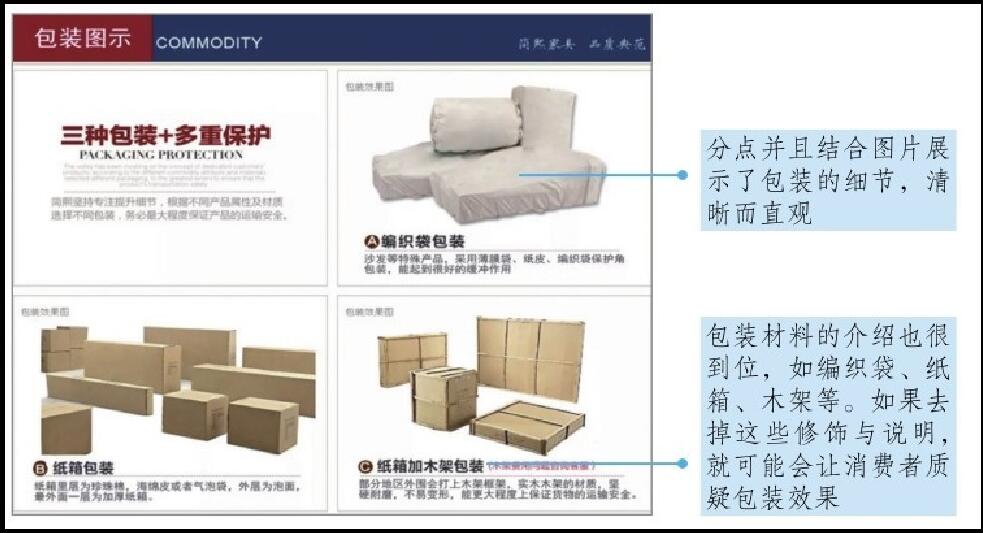 在網(wǎng)購家具的過程中,許多消費者會擔(dān)心因為運輸而導(dǎo)致家具零部件受損。針對這一擔(dān)憂,賣家就可以在包裝上做出犧牲,而這一犧牲也需要清晰明了地展示在消費者眼前。家具外包裝說明如圖4-19所示,從紙皮到編織纖維袋,從泡沫珍珠棉到2厘米厚泡沫再到木架包裝,以及對于五層包裝和包裝材料的逐步說明,足以讓消費者打消對于包裝的顧慮。