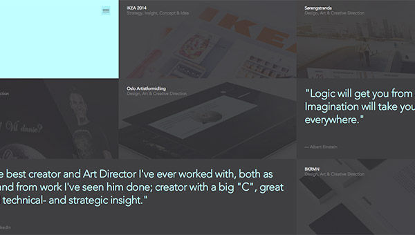 Jan Finnesand用了全屏的寬度與高度來放置方塊,每一塊都有特殊作用,大多展示了他以往的項目案例。充滿整個瀏覽器窗口的方塊造就了一件非??岬脑O(shè)計。