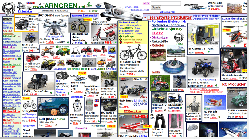 Arngren 這個(gè)90年代都算得上的網(wǎng)頁設(shè)計(jì)中反面典型的網(wǎng)站,最令人震驚的一點(diǎn)是它一直存在至今。這個(gè)以混亂擁擠而著稱的網(wǎng)站首頁信息量簡(jiǎn)直像是要爆炸開一樣,至于它究竟是一個(gè)在線商店還是線上目錄,根本沒有人會(huì)深究,因?yàn)榻^大多數(shù)人打開個(gè)網(wǎng)站的目的只有一個(gè):前來膜拜。想在這個(gè)被低像素貼圖塞滿的網(wǎng)站當(dāng)中找到特定的物品是一件真正意義上海底撈針的事情。