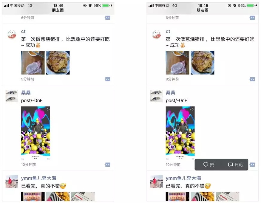 朋友圈點(diǎn)擊操作 icon,出現(xiàn)評(píng)論和點(diǎn)贊兩個(gè)操作按鈕。如果要點(diǎn)贊評(píng)論還要點(diǎn)擊對(duì)應(yīng)的點(diǎn)贊評(píng)論按鈕,為何不直接將點(diǎn)贊和評(píng)論按鈕放出來呢?從用戶操作的高效性來看,現(xiàn)在的朋友圈這種設(shè)計(jì)方式不夠高效,多增加了一個(gè)操作路徑。微信這樣設(shè)計(jì)是有什么背后的深意和思考呢?朋友圈的定位是分享生活,重點(diǎn)是分享而不是互動(dòng),如果將點(diǎn)贊和評(píng)論的入口直接放出來的話,用戶互動(dòng)頻率變高,導(dǎo)致點(diǎn)贊者和評(píng)論者的特意的意圖性和含量遠(yuǎn)遠(yuǎn)不如將兩個(gè)操作收起來的高。收起來的點(diǎn)贊評(píng)論所收到的贊美和互動(dòng)會(huì)讓分享者更真心實(shí)意,同時(shí)也減少了消息通知的無效打擾。這樣整個(gè)朋友圈互動(dòng)分享生態(tài)會(huì)變得更好。