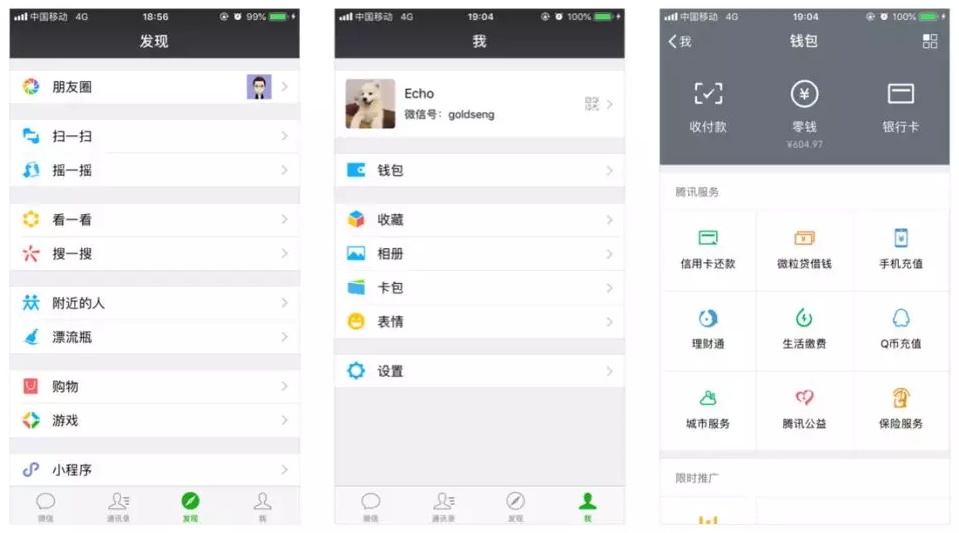 在互聯(lián)網(wǎng)產(chǎn)品中,幾乎所有產(chǎn)品的思路都是如何將產(chǎn)品做大,然后實(shí)現(xiàn)變現(xiàn)盈利。在中國用戶流量最大的 app 上可以有無限的變現(xiàn)玩法,向游戲、購物、支付這些都是強(qiáng)盈利的產(chǎn)品,而微信卻只以 tab 中的列表展示給用戶,這似乎不符合商業(yè)邏輯。如果將購物、游戲、支付再升一級(jí)進(jìn)行強(qiáng)化,那么微信給用戶的標(biāo)簽和定位不再是生活方式,而變成了一個(gè)單純的賣貨、游戲、支付平臺(tái),這樣的話可能會(huì)影響微信牢不可破的用戶認(rèn)知和產(chǎn)品地位。