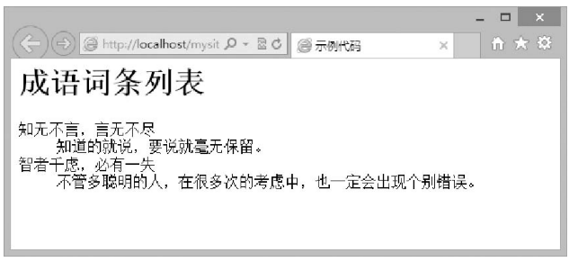 【示例】新建文檔,保存為test3.html。輸入下面代碼,使用定義列表顯示兩個成語的解釋。