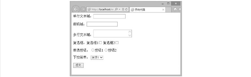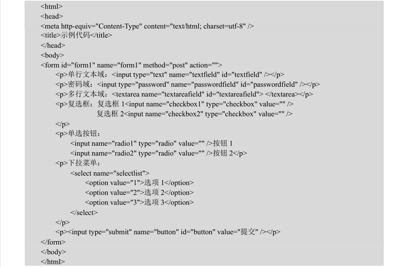 【示例8】新建文檔,保存為test7.html。輸入下面代碼,分別定義單行文本框、多行文本框、復選框、單選按鈕、下拉菜單和提交按鈕的表單。