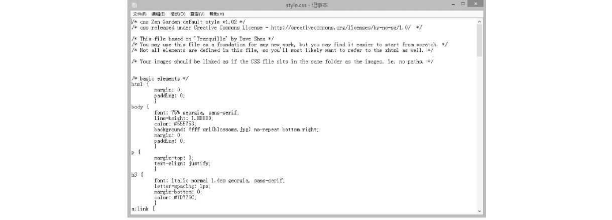 2.外部樣式表如果CSS樣式被放置在網(wǎng)頁(yè)文檔外部的文件中,則稱為外部樣式表,一個(gè)CSS樣式表文檔就表示一個(gè)外部樣式表。實(shí)際上,外部樣式表也就是一個(gè)文本文件,擴(kuò)展名為.css。當(dāng)把CSS樣式代碼復(fù)制到一個(gè)文本文件中后,另存為.css文件,它就是一個(gè)外部樣式表。如圖所示就是禪意花園的外部樣式表(http://www.csszengarden.com/)。