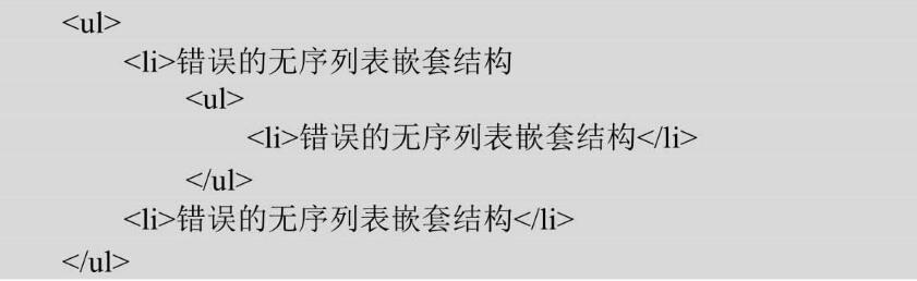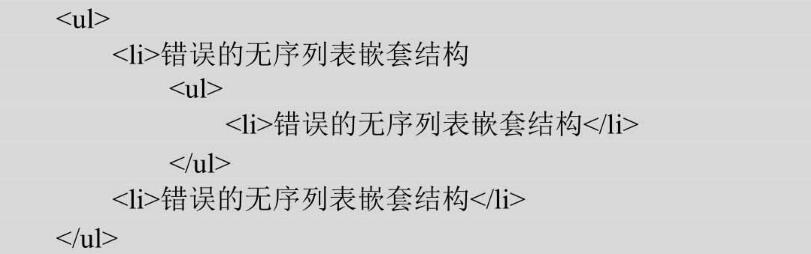 HTML對標簽有著相對嚴格的要求,每個標簽都必須關閉,而且每個標簽之間的嵌套要正確,尤其是列表的結構。下面羅列幾種在HTML中無序列表的錯誤嵌套方法。