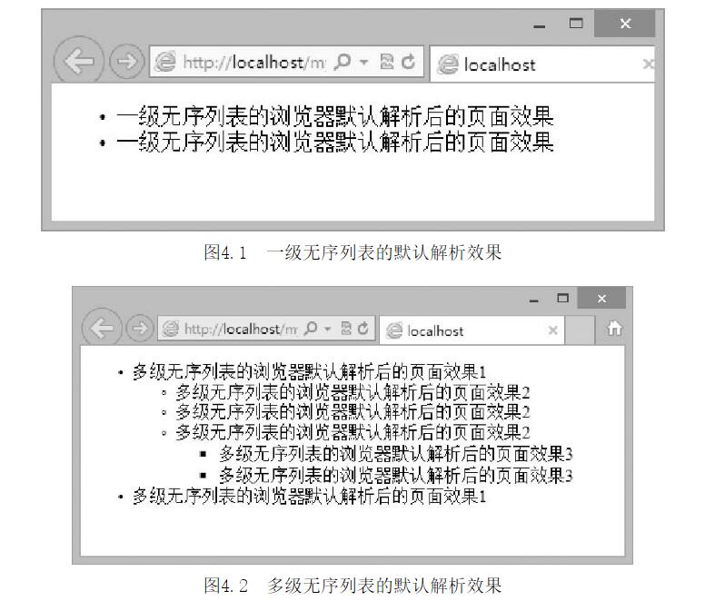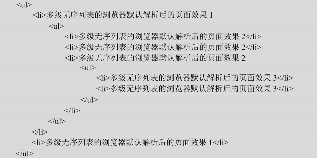 多級無序列表,在無任何樣式修飾的瀏覽器默認解析時顯示效果,如圖4-2所示。多級無序列表的默認解析效果通過效果圖可以發(fā)現(xiàn)無序列表在隨著其所包含的列表級數(shù)的增加而逐漸縮進,并且隨著列表級數(shù)的增加而改變不同的修飾符。瀏覽器在解析無序列表時,會不斷地對不同級別的無序列表進行縮進顯示,但修飾符卻只有3種。如果3層嵌套都無法滿足網(wǎng)頁中所需要使用的無序列表時,讀者就應該反思這個頁面中的列表嵌套是否過多了。合理地使用HTML標簽才能讓頁面的結構更加清晰,相對地更符合語義。不過不用擔心,如果網(wǎng)頁中實在需要更多層嵌套,并且是不同的修飾符時,還是可以利用CSS樣式來修改其修飾符的。好了,關于網(wǎng)站制作前端設計布局對于錯誤列表樣式的介紹今天就到這里,明天我們會繼續(xù)就網(wǎng)站制作時對于列表樣式的幾種正確處理方式做介紹。深圳博納網(wǎng)絡專業(yè)網(wǎng)站設計編輯整理。
