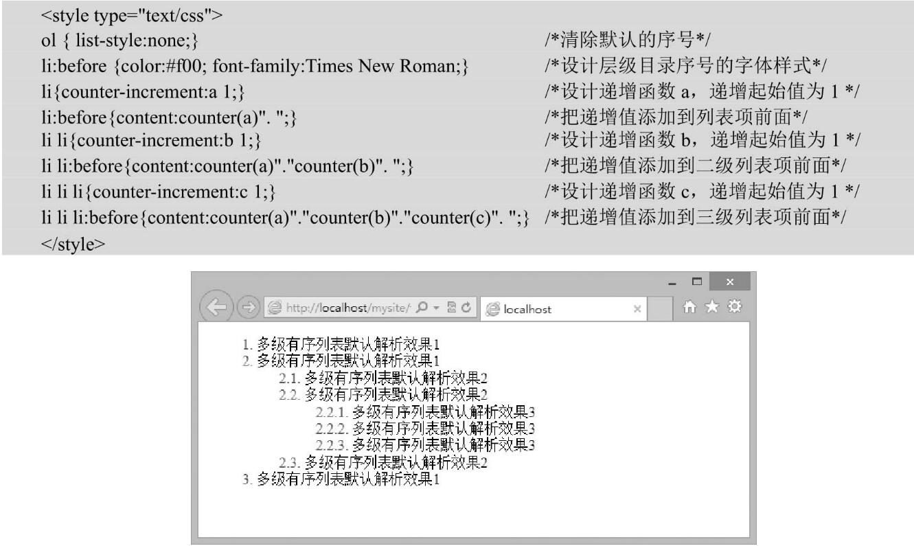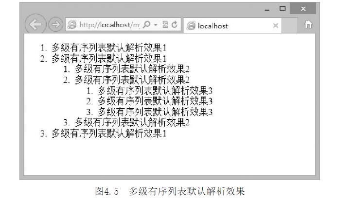 多級有序列表默認(rèn)解析效果有序列表在多級的情況下,理論上應(yīng)該是隨著層級的增加而出現(xiàn)1.1或者1.1.1之類的數(shù)字,但瀏覽器卻無法在網(wǎng)頁中直接解析出這樣的效果,如果需要使用1.1或者1.1.1之類的數(shù)字表示方式,那么就只能使用CSS、JavaScript或者手工加入。