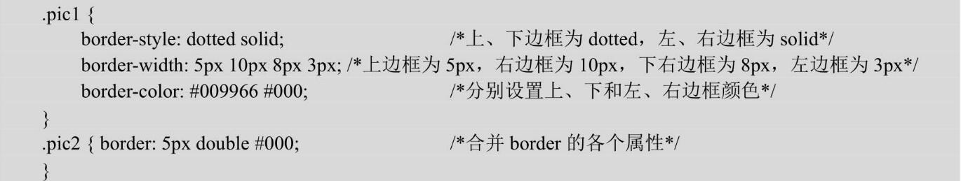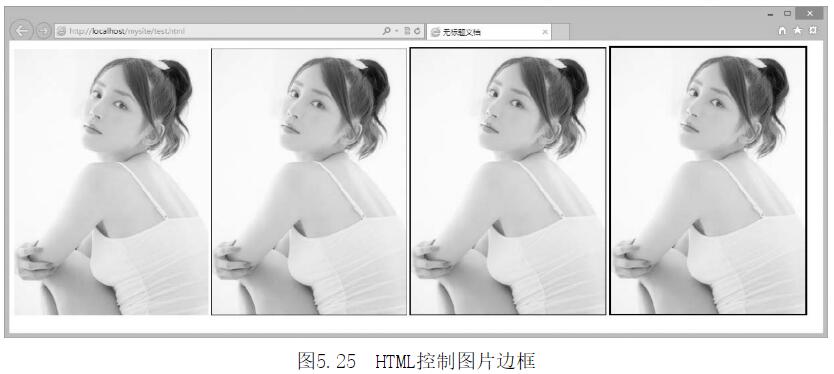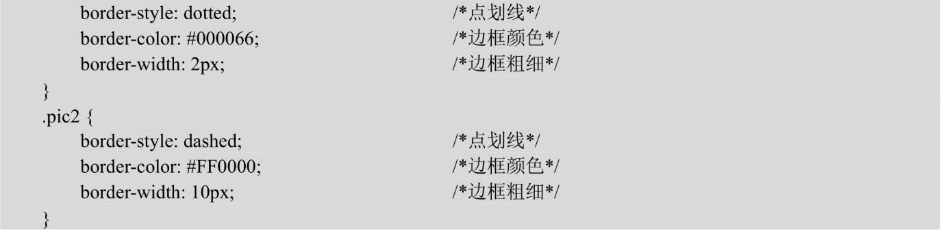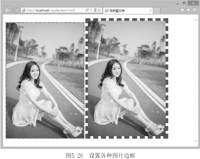通過圖5.25可以看到,用HTML控制圖片邊框是無法設(shè)計(jì)出豐富多彩的圖片效果的,需要使用CSS中的border-style、border-color和border-width3個(gè)屬性來定義邊框。其語法如下: