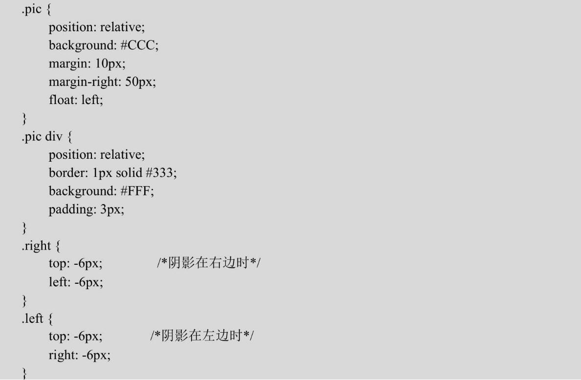 第3步,定義圖片的陰影。其實(shí)給圖片加陰影的原理很簡(jiǎn)單,就是運(yùn)用兩個(gè)<div>塊的相對(duì)位置偏移而實(shí)現(xiàn),陰影的寬度和顏色深淺由用戶決定,也就是css中的相對(duì)定位屬性position:relative,。