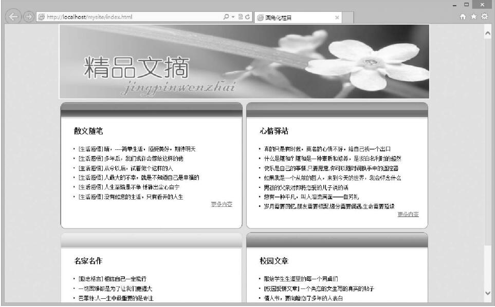 欄目圓角化是網(wǎng)上常見的以種美化網(wǎng)頁的方法,本例運(yùn)用上面介紹的圖片圓角化方法,通過設(shè)置個(gè)名為《X品文摘》的網(wǎng)頁,從而進(jìn)步講述css設(shè)置圖片的方法。本例的演示效果如圖5.55所示。