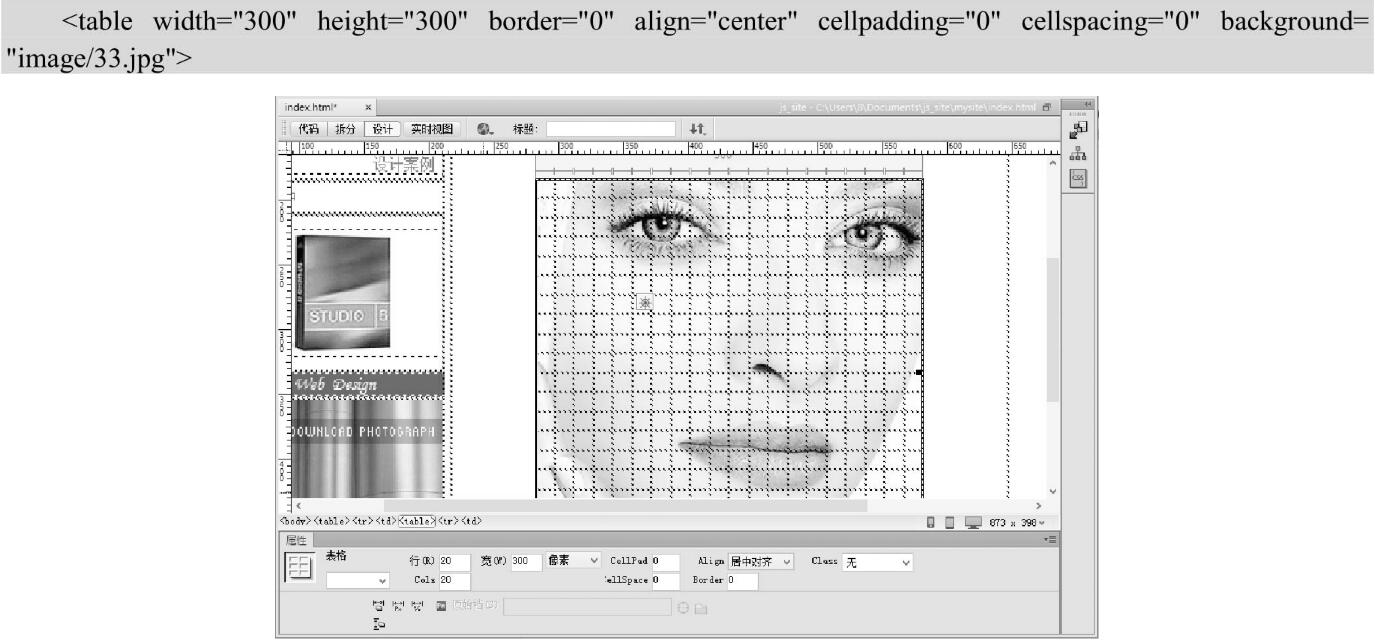 第1步,在主體表格的第2個(gè)單元格中插入個(gè)20行20列的表格,設(shè)置大小300×300像素。然后設(shè)置背景圖像,效果如圖6.39所示。設(shè)置表格屬性的代碼如下: