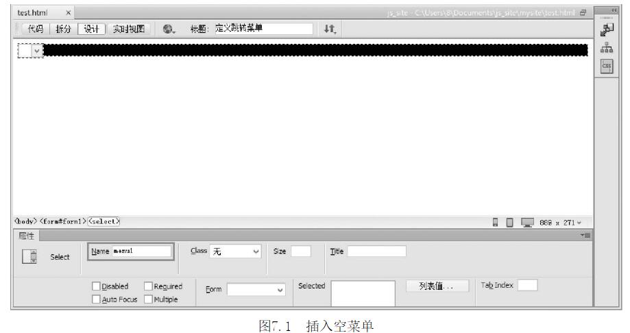 第1步,啟動Dreamweaver,新建文檔,保存htest.html。將鼠標指針定位到預定義位置,選擇【插入】【表單】【選擇】命令,插入一個空的下拉菜單控件,在【屬性】面板中設置Name為menul.如圖7.1所示。
