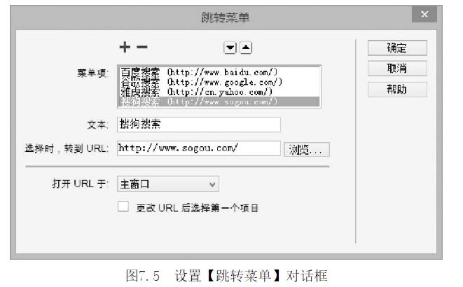 第5步,在【打開URL于】下拉列表框中設置打開鏈接的窗口。如果選中【更改URL后選擇第個項目】復選框,可以設置在跳轉菜單鏈接文件的地址發(fā)生錯誤時,自動轉到菜單中第個項目的網(wǎng)址,如圖7.4所示。
