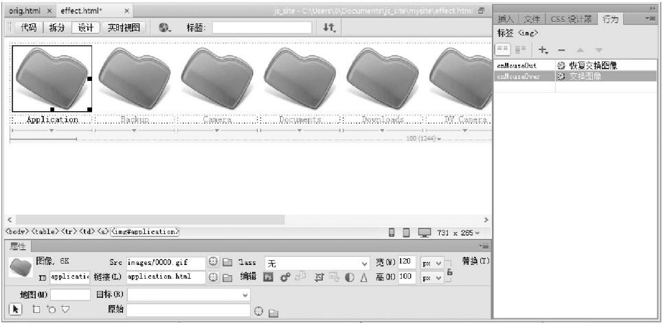 第1步,打開本站示例中的orig.html文件,另存為effect.html。設計當鼠標經(jīng)過縮略圖時,顯示翻轉圖像。