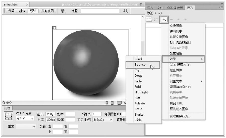 第3步,選中標(biāo)簽<div id:”apDivl”>,選擇【窗口】 【行為】命令,打開(kāi)【行為】面板,單擊加號(hào)按鈕,從彈出的下拉菜單中選擇【效果】 Bounce命令,如圖7-53所示。