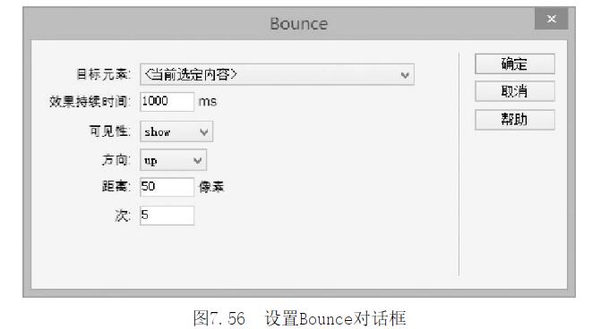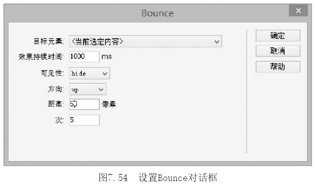 第4步,打開(kāi)Bounce對(duì)話框,設(shè)置【目標(biāo)元素】為“<當(dāng)前選定內(nèi)容>”,【效果持續(xù)時(shí)間】為1OOOms,即秒鐘;設(shè)置【可見(jiàn)性】為hide,即效果結(jié)束后隱藏元素;設(shè)置【方向】為up,即定義目標(biāo)對(duì)象向上彈跳,定義【距離】為50像素,【次】為5次,設(shè)置如圖7-54所示。設(shè)置完畢,單擊【確定】按鈕完成操作。