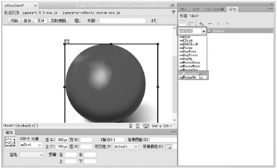 第5步,在【行為】面板中可以看到新增加的行為,單擊左側(cè)的onClick,從彈出的下拉菜單中選擇onMouseOver,即設(shè)計(jì)當(dāng)鼠標(biāo)經(jīng)過(guò)正文區(qū)域時(shí),將觸發(fā)彈跳特效,設(shè)置如圖7-55所示。