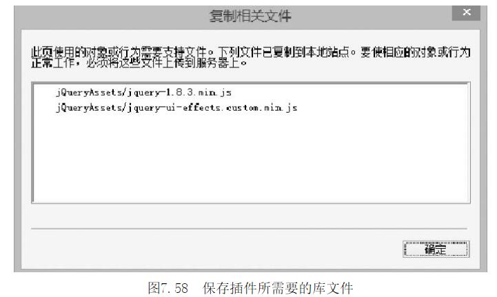 第8步按Ctrl+S快捷鍵保存頁(yè)面,此時(shí)Dreamweaver會(huì)彈出對(duì)話框,提示保存兩個(gè)插件文件,如圖7-58所示。單擊【確定】按鈕,保存jquerv-l.8.3min.jsjquery-ui-effectscustommin.js兩個(gè)庫(kù)文件。
